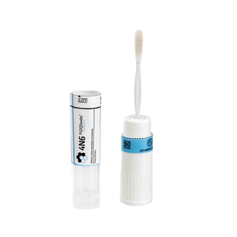 Ecouvillon floque, FloqSwabs 4N6 genetics est dediee a la collecte de l'ADN pour l'identification humaine, emballage individuelle dans une pochette, point de rupture 20 mm. Boite de 1000 ecouvillons FloqSwabs 4N6 genetics. Fabricant : Copan