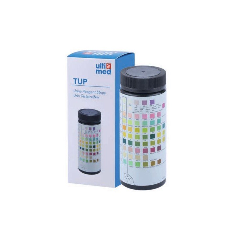 Bandelettes reactives urinaires pour analyse d'urine, pour tests de : glucose, sang, proteine, nitrite, leucocytes.100 tests.Les resultats des tests peuvent fournir des informations concernant l'etat du metabolisme des glucides, la fonction renale et hepatique, l'equilibre acido-basique et la bacteriurie. Les resultats sont obtenus en comparant le changement de couleur des champs reactifs avec les blocs de couleur sur l'etiquette du flacon. Aucun calcul ni instrument de laboratoire n'est requis.