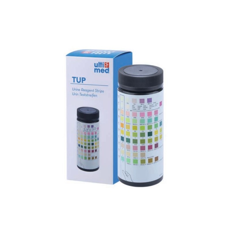 Bandelettes reactives urinaires pour analyse d'urine, pour tests de : glucose, pH,gravite specifique, urobilinogen, Bilirubin, sang, proteine, nitrite, leucocytes, Ketone.100 tests.Les resultats des tests peuvent fournir des informations concernant l'etat du metabolisme des glucides, la fonction renale et hepatique, l'equilibre acido-basique et la bacteriurie. Les resultats sont obtenus en comparant le changement de couleur des champs reactifs avec les blocs de couleur sur l'etiquette du flacon. Aucun calcul ni instrument de laboratoire n'est requis.