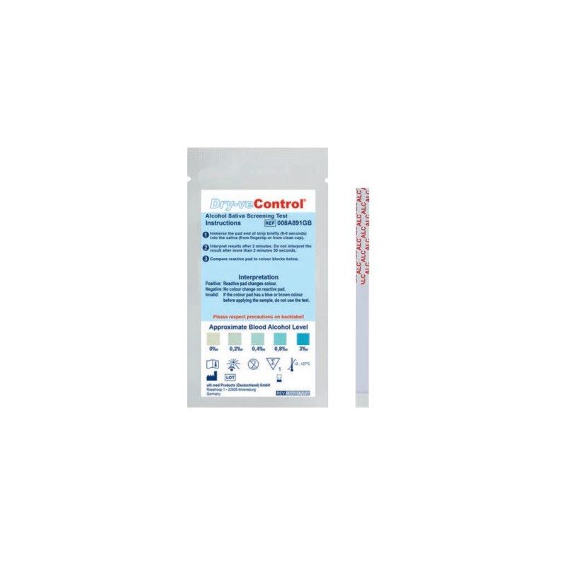 Alcootest salivaire, Dry-ve Control d'Ultimed est un test rapide, methode tres sensible pour detecter la presence d'alcool dans la salive et fournit une approximation de taux d'alcoolemie. Cet appareil de test montre un haut degre de sensibilite et peut detecter un 0,2 a 3 pour mille de concentration d'alcool dans la salive. Ce test fournit uniquement un ecran preliminaire. Un produit chimique alternatif plus specifique doit etre utilisee afin d'obtenir une confirmation resultat analytique. La consideration clinique et le jugement professionnel doivent etre appliques a tout test de depistage resultat, en particulier lorsque des tests positifs preliminaires sont indiques.