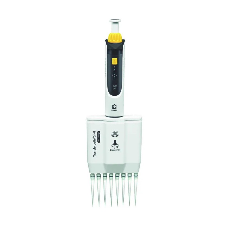 Micropipette multicanaux Transferpette S, 8 canaux variable, Modele M8-100, volume variable de 10 - 100 ul, precision +/- 0,8 pour cent. Cette micropipette a piston pour volume variable est ambidextre, elle permet un reglage du volume, le pipetage et l'ejection de la pointe avec seulement une main (gauche ou droite). Le reglage du volume se manipule aisement avec des gants, sa protection evite un changement accidentel du volume a pipeter. Temperature d'utilisation : 15 - 40 degre Celsius, pression de vapeur maximale : 500 mbar, viscosite : 260 mPas. Pipette multicanaux Transferpette a piston de Brand.