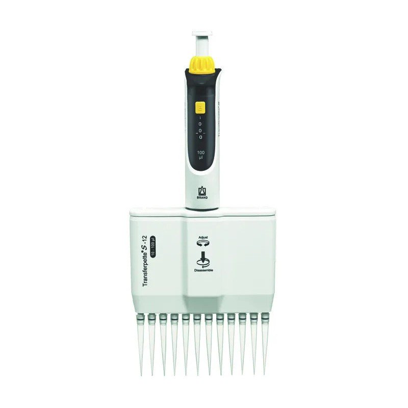 Micropipette multicanaux Transferpette S, 12 canaux variable, Modele M12-100, volume variable de 10 - 100 ul, precision +/- 0,8 pour cent. Cette micropipette a piston pour volume variable est ambidextre, elle permet un reglage du volume, le pipetage et l'ejection de la pointe avec seulement une main (gauche ou droite). Le reglage du volume se manipule aisement avec des gants, sa protection evite un changement accidentel du volume a pipeter. Temperature d'utilisation : 15 - 40 degre Celsius, pression de vapeur maximale : 500 mbar, viscosite : 260 mPas. Pipette multicanaux Transferpette a piston de Brand.