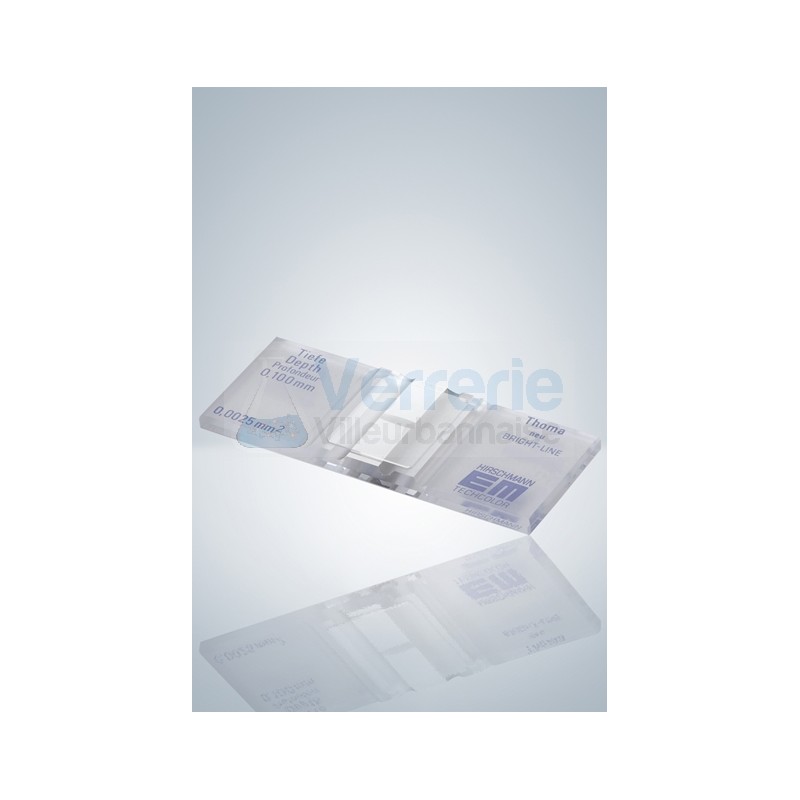 Cellules de numeration d'apres Neubauer, lignes claires CE d'apres IVD 98/79CE. profondeur : 0,1 mm. Double quadrillage, avec 2 lamelles hématimètres incluses. Numéro de lot sur l'emballage, portant la mention: utilisable jusqu'au, marque CE de conformité à DIV 98/79 CE.