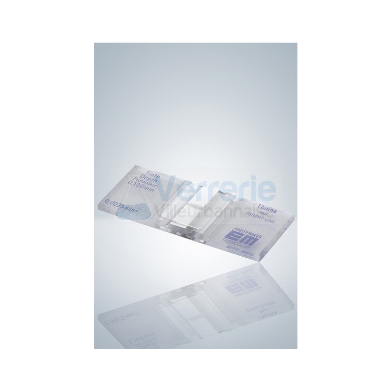 Cellules de numeration d'apres Nageotte, lignes claires CE d'apres IVD 98/79CE. profondeur : 0,5 mm. Double quadrillage, avec 2 lamelles hématimètres incluses. Numéro de lot sur l'emballage, portant la mention: utilisable jusqu'au, marque CE de conformité à DIV 98/79 CE.