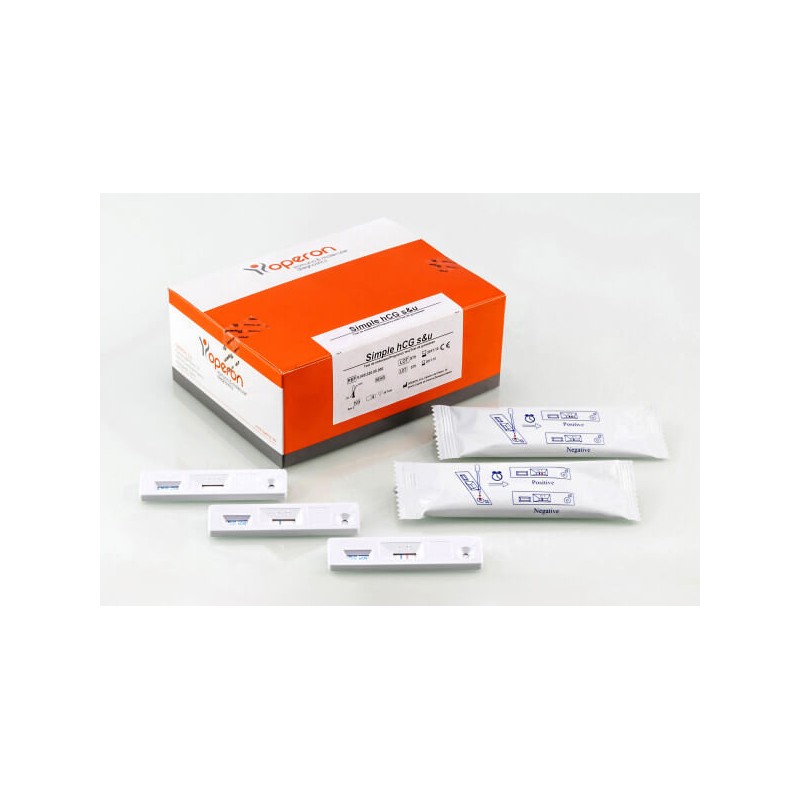 Test immunochromatographique en une etape pour la detection qualitative de l'hormone gonadotrophine chorionique humaine (hCG) dans le serum et l'urine. Ce test a ete developpe pour offrir une aide rapide et efficace dans le diagnostic de grossesse , il peut etre effectue le premier jour manque des regles d'une femme et fournit un resultat en seulement 3 a 5 minutes. Dans ce test, l'echantillon de serum ou d'urine est place directement sur la bandelette , aucun traitement prealable n'est necessaire.