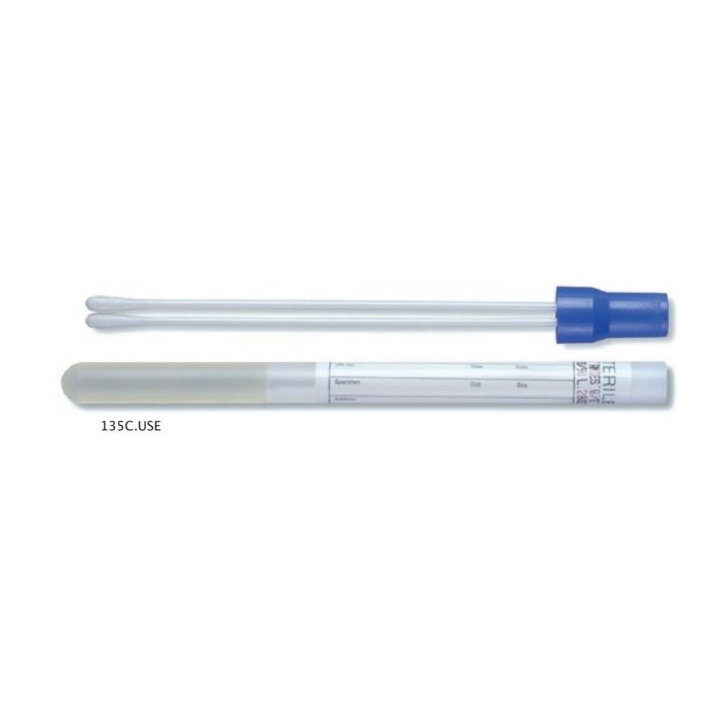 Ecouvillon double en plastique avec tube rempli de gel stuart agar, bouchon bleu. Prelevements : gorge,vaginal,plaie,cutane. Temperature de stockage : 5-25 degre. Fabricant : Copan. Fiche Commerciale