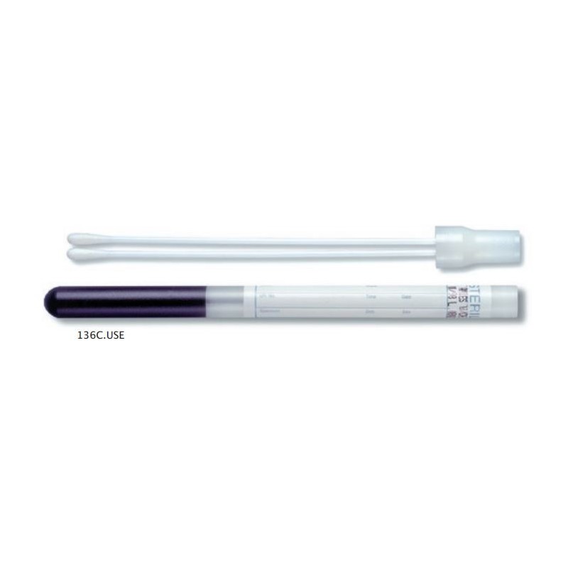 Ecouvillon double en plastique avec tube rempli de gel amies agar avec charbon actif, bouchon blanc. Prelevements : gorge,vaginal,nasal,plaie,cutane, ( culture anaerobique,aerobique). Temperature de stockage : 5-25 degre. Fabricant : Copan. Sachet de 500 ecouvillons de transport d'echantillons Fiche Commerciale