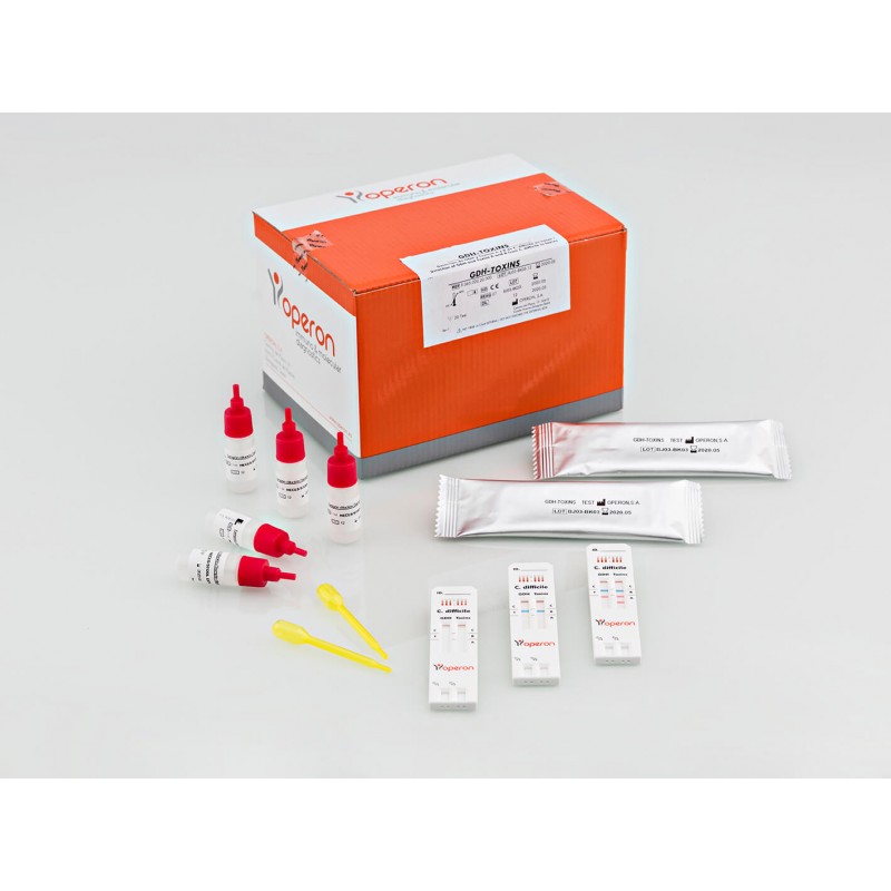 Test immunochromatographique en une etape pour la detection differentielle de la glutamate deshydrogenase (GDH) ainsi que des toxines A et B de C. difficile dans les feces humaines.