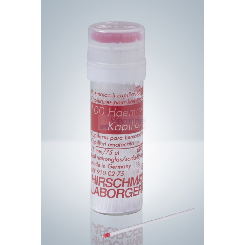 Capillaires à hématocrite à usage unique pour centrifuger des échantillons de sang, héparinés au sodium, avec numéro de LOT sur l’emballage, portant la mention: utilisable jusqu’au, DIN EN ISO 12772, marque CE de conformité à DIV 98/79 CE. Tube Hématocrite 75 µl diamètre 1.42-1.68 mm longueur 75 mm diamètre interne 1.07-1.23 mm. Fabricant : Hirschmann
