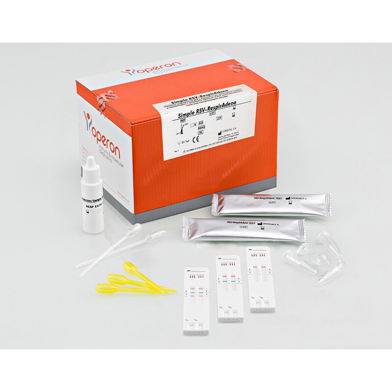 Le test immunochromatographique OPERON RSV-RespirAdeno est un test rapide pour la detection qualitative et differentielle du virus respiratoire syncytial (VRS) et de l'adenovirus dans les ecouvillons, les lavages et les aspirations nasopharynges.