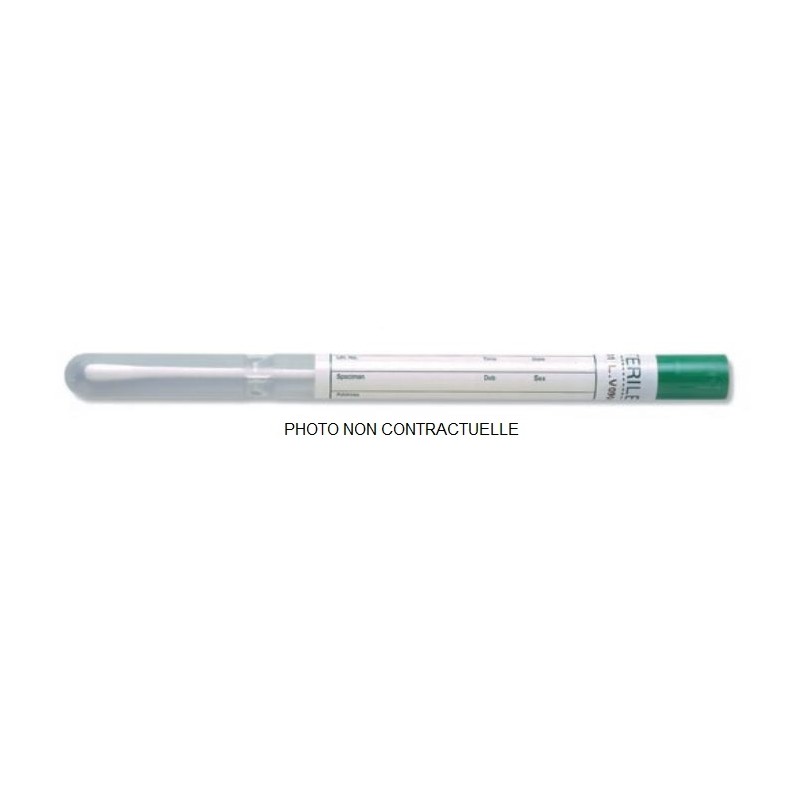 Ecouvillon sec et ordinaire tige en plastique pointe Dacron, avec tube de transport capuchon vert. Fabricant Copan. Temperature de stockage 5-25 degre. Sachet de 1000 ecouvillons avec tubes de transport Fiche Commerciale
