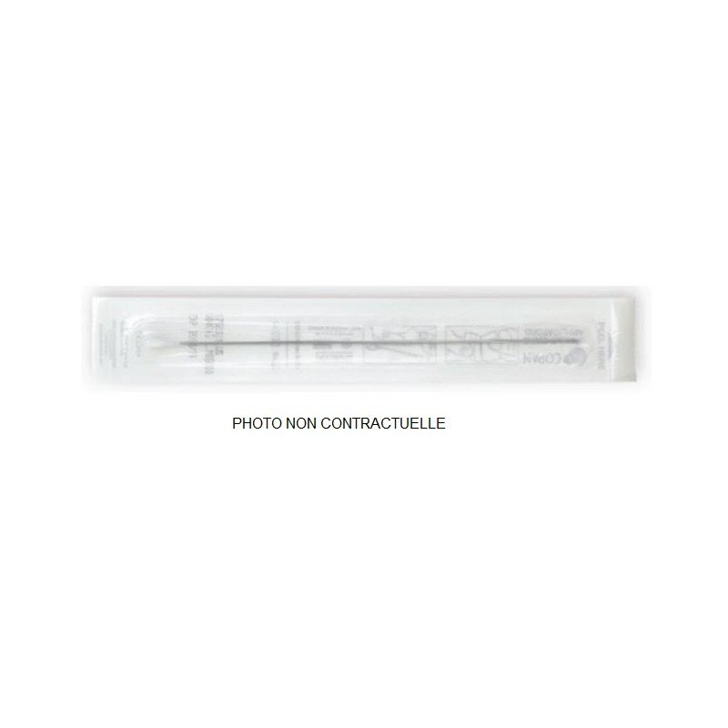 Ecouvillon sec et ordinaire tige en bois pointe en coton, emballage individuel dans pochette. Fabricant Copan. Temperature de stockage 5-25 degre. Sachet de 1000 ecouvillons secs sans tubes de transport Fiche Commerciale