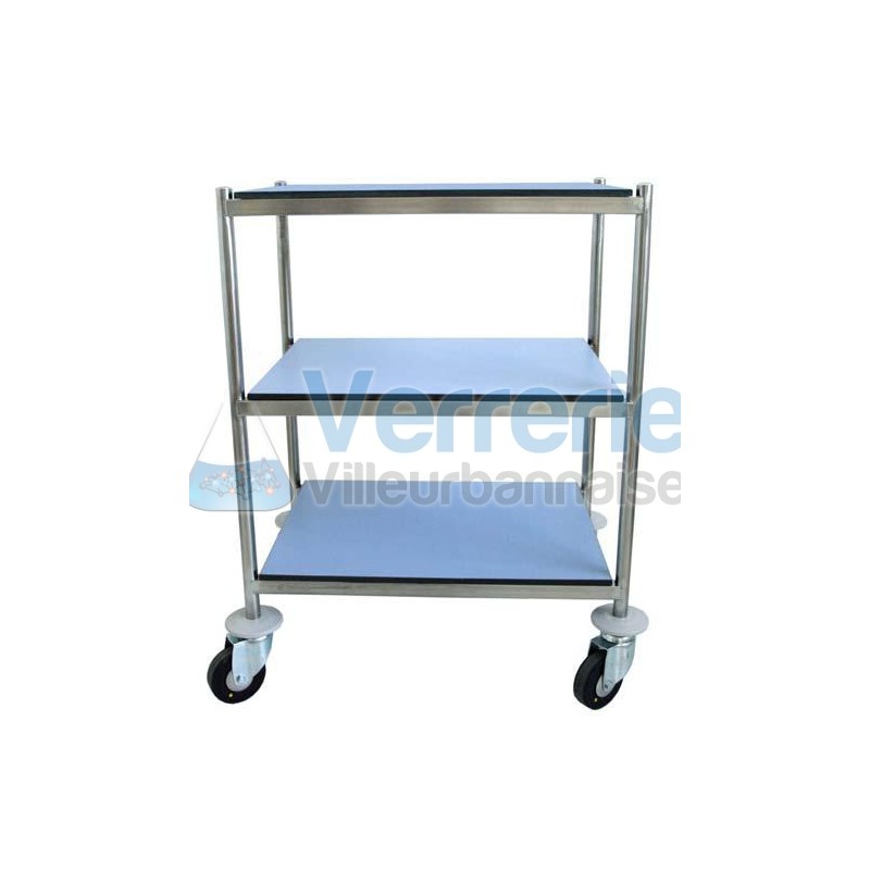 chariots inox inox 18/10 plateaux COMPACT 3 plateaux L. 600 x 400 mm couleur bleu Oslo Structure en acier ionxydable 18/10 entierement soude sous argon, plateaux en compact qualite LABO tacheclean M1 roues diam. 100 mm Haut. Sol/plateau superieur 855 mm Haut. Entre les plateaux 275 mm
