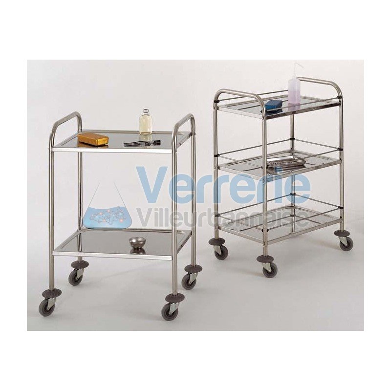 chariots inox 3 plateaux inox 18/10 avec galeries L. 750 x 500 mm livre demonte Haut. des plateaux par rapport au sol : 200, 510 et 820 mm pare-chocs annulaires diam. 95mm Entierement en acier inoxydable 18/10. Tres belle finition poli brillant. Grande stabilite.Entretien aise. Charge max. 60kg repartis sur les plateaux 2 poignees de poussee , plateaux emboutis, tube diam. 25mm roues diam. 75mm non tachantes.