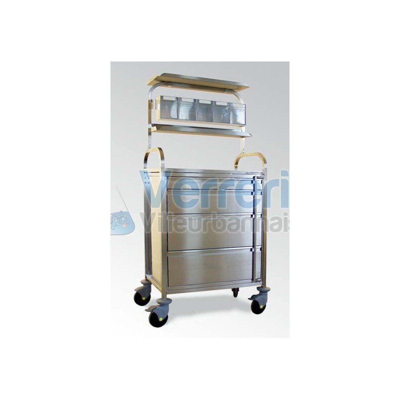 Chariot d'anesthesie equipe de 1 tiroir Ht 75, 1 tiroir Ht 150 et 2 tiroirs Ht 230 tout inox , d'un plan de travail a hauteur du sol 1005mm 4 roues antistatiques diam 125mm dont 2 a freins tout inox avec portique, tablette EVP T, etagere EVP E