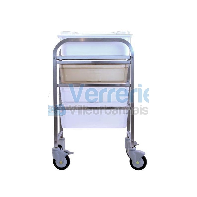 Chariot de decontamination Dim. 570x590mm Ht 945mm Chariot de decontamination Dim. 570x590mm Ht 945mm concu pour recevoir des bacs de decontamination en inox dim 530x325mm mais egalement des tablettes , fournis avec 4 roulettes de diam 125mm dont 2 a frein