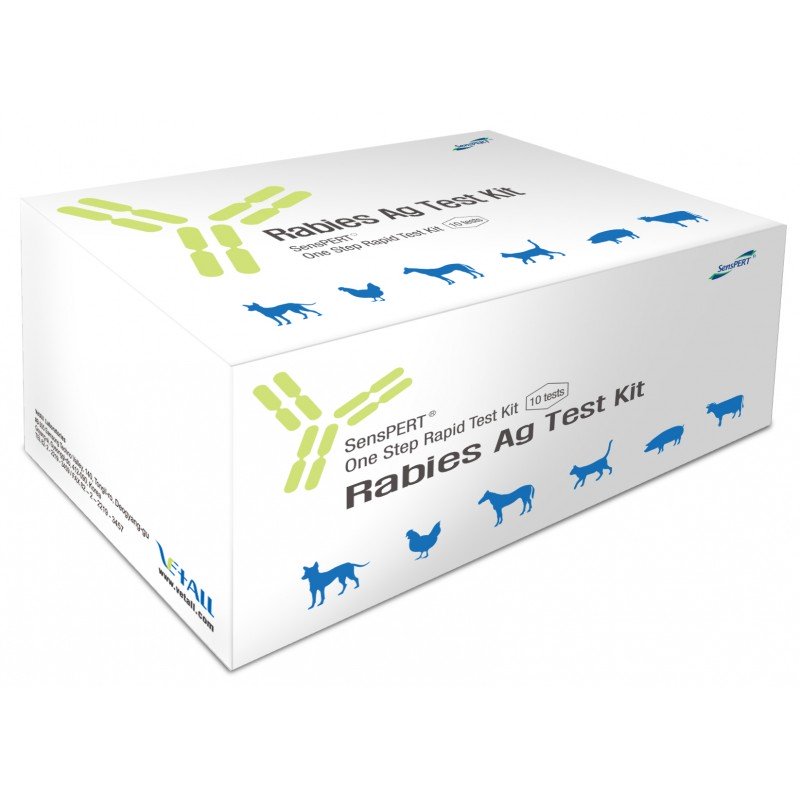 Test rapide de la rage sur les chiens, les bovins et les chiens viverrins. Test detectant les antigenes de la rage en 5-10 minutes, Echantillon: secretion de salive,10 pour cent d'homogenats de cerveau. Temperature de stockage 2-30 degre.