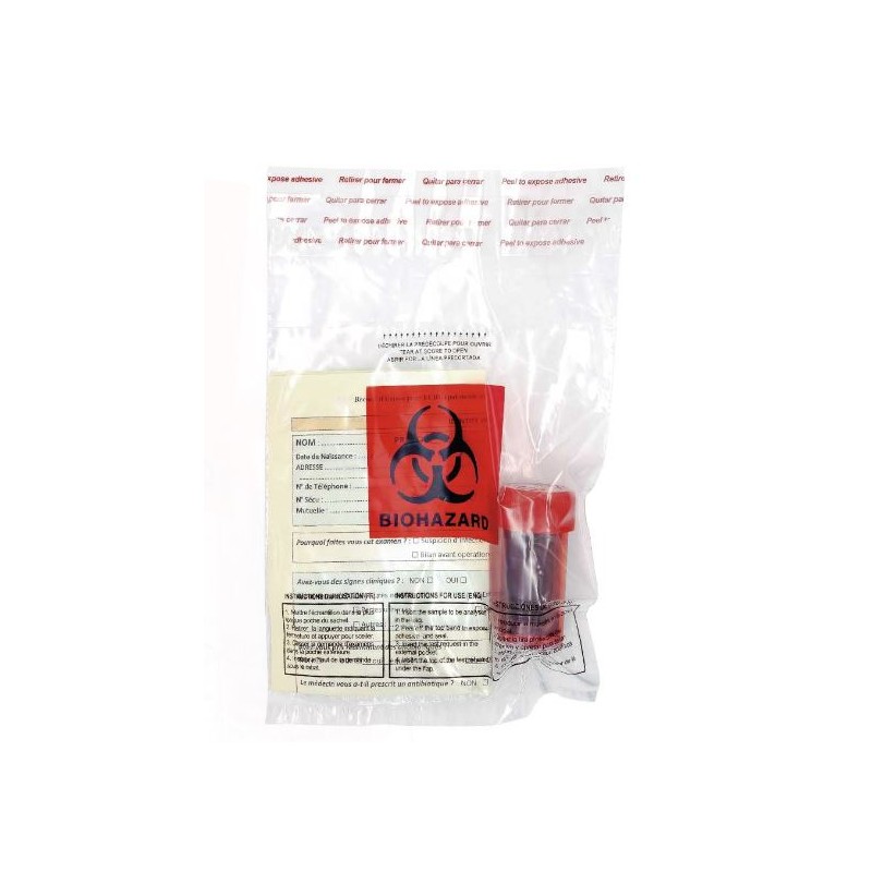 Sacs a fermeture par pression zip lock avec poche kangourou simple (ouverte), modele 3 feuilles avec soudure de fond. Sacs en PEBD transparent, epaisseur 50 µm. Avec impression une couleur sur une face PREL. BIOHAZARD Dimensions 160x220 mm Dimensions poche 160x200 mm. Boite de 1000.