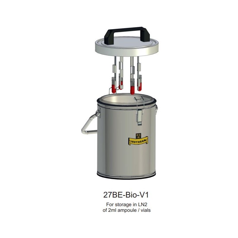 Dewar 2 litres pour stockage de 4 vials dans du gaz LN2 pour echantillons biologiques, temps de stockage maxi : 14 heures, poids 2,3 kg. Stockage sans pression. Dewar DIN EN ISO 16496, recipient en verre borosilicate ISO 3585, recipient en verre protege par le boitier en inox. Poignee en aluminium, couvercle en polyethylene, version V1 avec percage sur le couvercle pour sortie de gaz LN2 . Stockage des echantillons jusqu'a -196 degre Celsius. Vials vendus separement. . Modele : 27BE-BIO-V1 . Model: 27BE-BIO-V1. Diametre interieur : 138mm diametre du dewar : 170mm hauteur du dewar : 245mm hauteur interne du recipient : 170mm, poids : 2,3 kg, duree de stockage a temperature : 14heures, taux d'evaporation : 3,13. Diametre interieur : 138mm diametre du dewar : 170mm hauteur du dewar : 245mm hauteur interne du recipient : 170mm, poids : 2,3 kg, duree de stockage a temperature : 14heures, taux d'evaporation : 3,13.