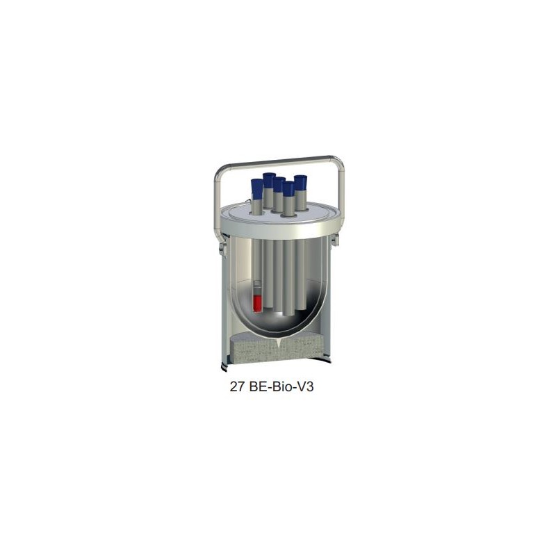 Dewar 4 litres pour stockage de 15 vials a sec en phase gazeuse dans du gaz LN2 pour echantillons biologiques, temps de stockage maxi : 14 heures, poids 2,3 kg. Stockage sans pression. Dewar DIN EN ISO 16496, recipient en verre borosilicate ISO 3585, recipient en verre protege par le boitier en inox. Poignee en aluminium, couvercle en polyethylene. Stockage des echantillons jusqu'a -196 degre Celsius.Vials vendus separement. . Modele : 29BE-BIO-V3 . Model: 29BE-BIO-V3. Diametre interieur : 138mm diametre du dewar : 170mm hauteur du dewar : 385mm hauteur interne du recipient : 310mm, poids : 3,3 kg, duree de stockage a temperature : 33heures, taux d'evaporation : 2,71. Diametre interieur : 138mm diametre du dewar : 170mm hauteur du dewar : 385mm hauteur interne du recipient : 310mm, poids : 3,3 kg, duree de stockage a temperature : 33heures, taux d'evaporation : 2,71.