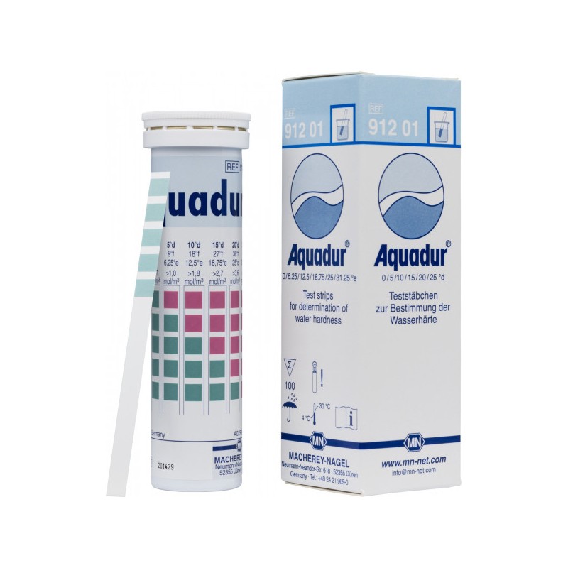 Kit de test AQUADUR 5–45, pour la dureté de l’eau, utilisation facile par les changements clairs de couleur du vert au rouge9 • > 18 • > 27 • > 36 • > 45 °f Durée de vie : 2 ans Température de stockage : 4-30°C