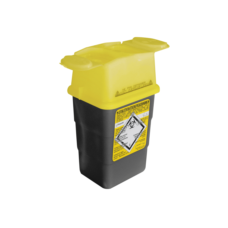 Collecteur de dechets et d'aiguilles SHARPSAFE Modele SHARPSAFE NF 1 Litre, cartons de 100 collecteurs de dechets medicaux perforants. Conteneur de 1000 ml concus pour la collecte de dechets medicaux perforants comme les lames de bistouri, les aiguilles, les seringues etc. Sharpsafe, certifiee EN ISO 23907-1 :2019 (obligatoire en France au 01/01/2022) est la premiere gamme integrant des matieres plastiques recyclees totalement controlees (validation marque KiteMark). Modele 5eme generation. Poubelle pour elimination des dechets lies aux Activites de Soins a Risques Infectieux dits DASRI.