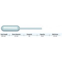 Pipette Pasteur non graduee, 3,5ml, longueur 83 mm, 22 gouttes par ml, emballage individuellement dans une pochette sterile. Carton de 1000 pipettes pasteur jetable. Fabricant : Copan Fiche Commerciale