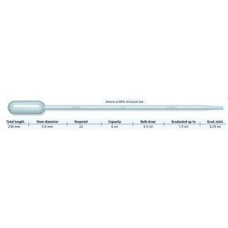 Pipette Pasteur gradue jusqu'a 1,5 ml tous les 0,5ml, longueur 230 mm, 22 gouttes par ml, emballage individuel dans une pochette. Carton de 2400 pipettes pasteur jetable. Fabricant : Copan Fiche Commerciale