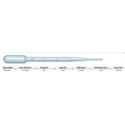 Pipette Pasteur gradue jusqu?a 2 ml tous les 0,5ml, longueur 155 mm, 22 gouttes par ml, non sterile. Carton de 5000 pipettes pasteur jetable. Fabricant : Copan Fiche Commerciale