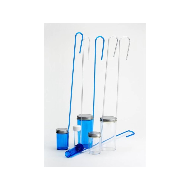 Flacon d'echantillonnage 30 ml en PS/PP, transparent, longueur de la poignee 385 mm, emballage individuel et sterilisation par irradiation gamma, teste pour la norme EN 14254 pour l'etancheite. Peut-etre utilise pour les liquides ou les poudres ou les produits alimentaire.