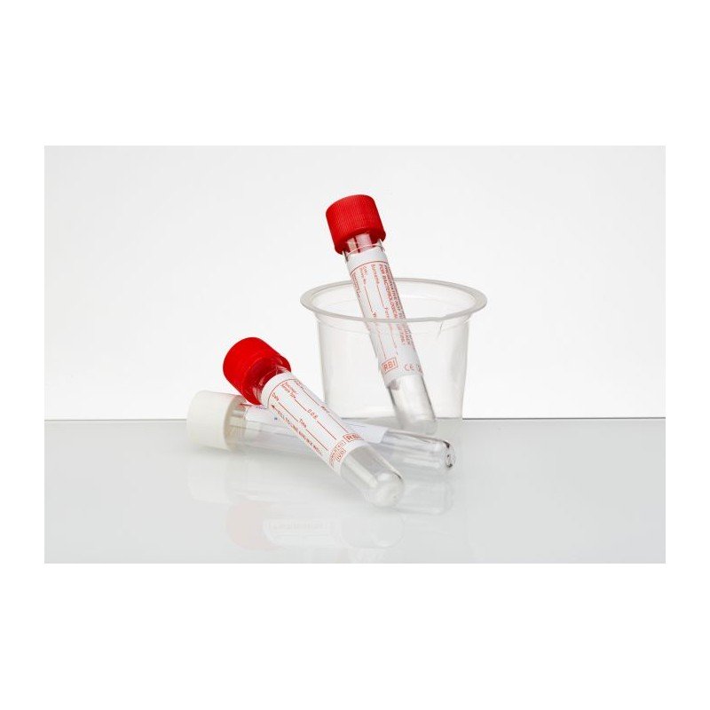 Tube de prelevement d'urine ideal pour analyseurs automatise 16x100 mm , 11 ml sterilise par oxyde d'ethylene, emballe en vrac, avec coupelle, etiquette, marquage CE, bouchon en polypropylene.
