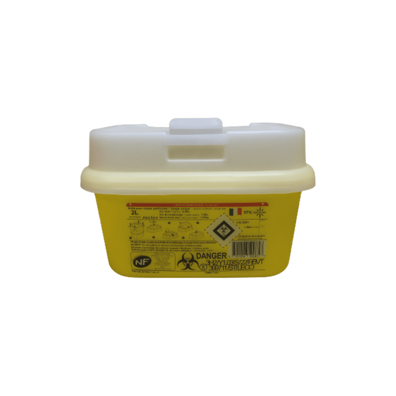Collecteur de dechets et d'aiguilles STILECO PACTO+ Collecteur 2 litres, cartons de 50 collecteurs de 2000 ml de dechets medicaux perforants. Boites a aiguilles et autres dechets d?activites de soins piquants coupants tranchants. STIL?ECO est le seul fabricant francais a proposer des collecteurs d?aiguilles certifies NF 302. En plus de la double certification NF 302 / NF EN ISO 23907-1 , les produits sont egalement homologues ADR. pour le transport des marchandises dangereuses.\