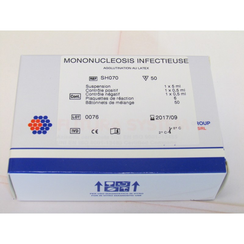 Le kit est base sur la combinaison des anticorps specifiques du serum des patients atteints de mononucleose infectieuse, avec un extrait d'erythrocytes de b?uf liee a des particules de latex. Fiche Technique Fiche de securité